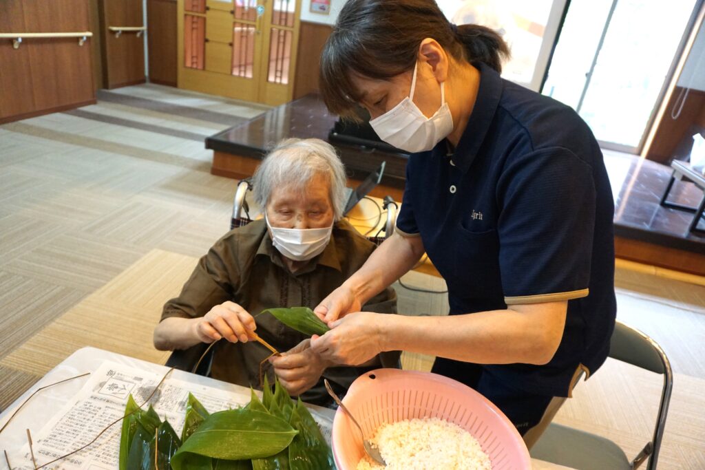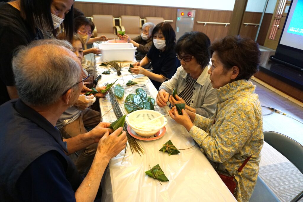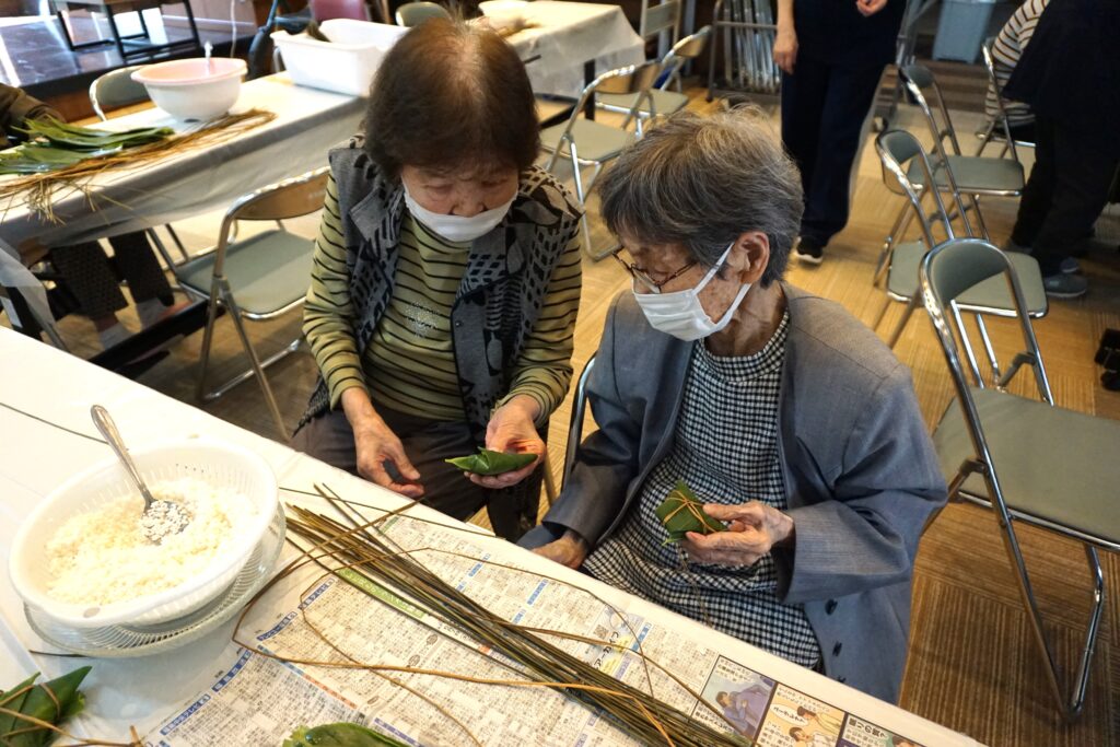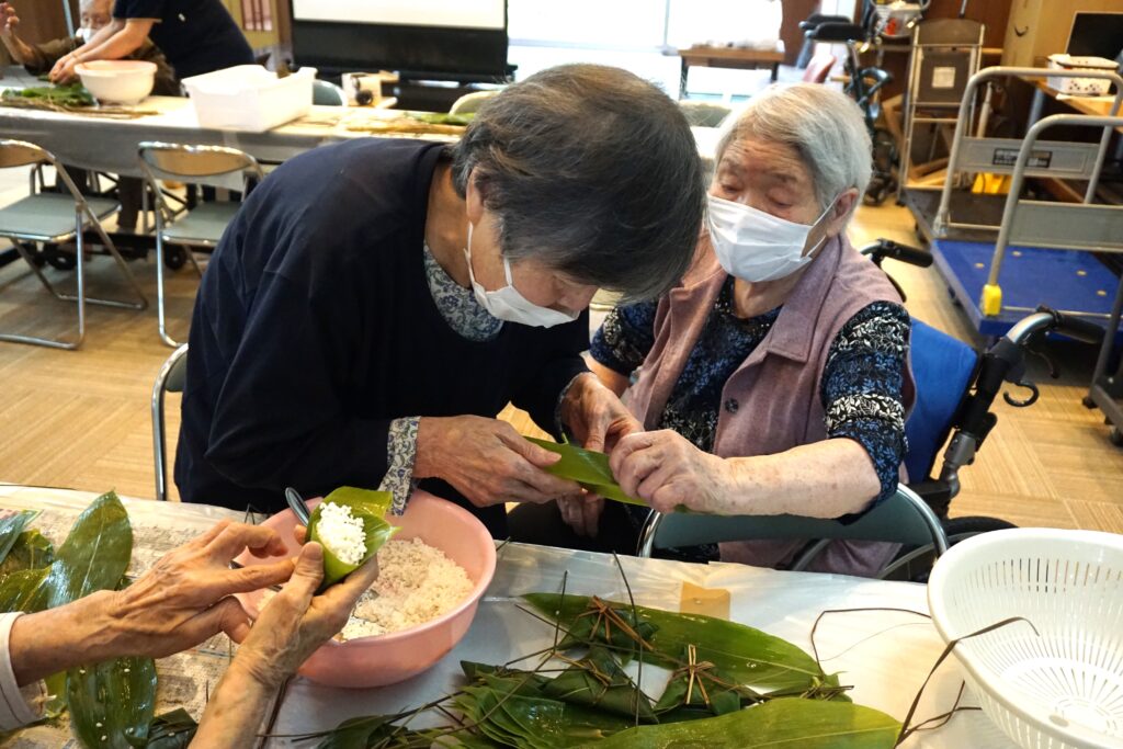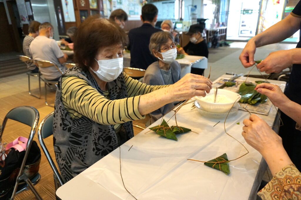 慣れた手つきで作る利用者様に教わりながら、苦戦しながらもみなさんで楽しく、たくさんの笹巻きが出来上がりました。